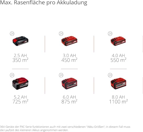 | Features | Power X-Change – Der Akku-Rasenmäher RASARRO 36/42 (2×5,2 Ah) ist Teil der Einhell Power X-Change Familie, in der Akkus, Ladegeräte und Systemgeräte kombiniert werden können., PurePOWER Brushless – Der wartungsarme und kraftvolle Brushless-Motor sorgt für maximale Leistung bei längerer Laufzeit im Vergleich zu herkömmlichen Kohlebürstenmotoren., Für 725 m² – Der 36 V Akku-Rasenmäher mit 50 Liter Fangbehälter arbeitet mit einer Schnittbreite von 42 cm und wird für Rasenflächen bis 725 m² empfohlen., Variable Schnitthöhe – Die Schnitthöhe des Akku-Rasenmähers lässt sich 6-stufig, zentral zwischen 25 mm und 75 mm einstellen und individuell an jeden Rasen anpassen., Komfortable Arbeit – Der höhenverstellbare, teleskopier- und klappbare Aluminium-Führungsholm lässt sich individuell an die Körpergröße anpassen, um rückenschonend zu arbeiten., Mulchfunktion – Setzt man den mitgelieferten Mulchkeil ein und lenkt den Auswurf um, wird das Schnittgut zur natürlichen Düngung direkt auf dem Rasen verteilt., Inkl. Akkus – Der Einhell Akku-Rasenmäher RASARRO 36/42 (2×5,2 Ah) wird mit zwei 5,2 Ah Akkus und einem Twincharger geliefert. |