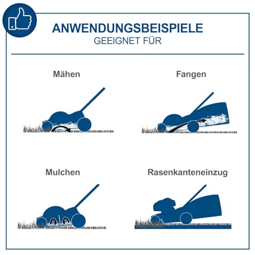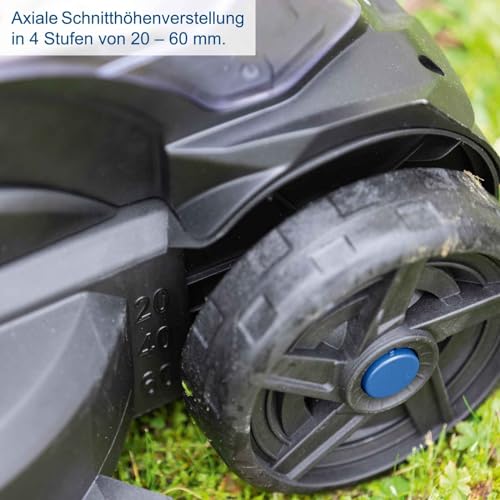 Die 32 cm Schnittbreite ermöglicht ein zügiges Arbeiten, während die axiale Schnitthöhenverstellung in 4 Stufen dir die Flexibilität gibt, die Schnitthöhe an verschiedene Arten von Gras oder die jeweiligen Wetterbedingungen anzupassen.