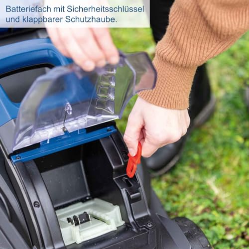 Die einfache Handhabung des Rasenmähers ist bemerkenswert. Der klappbare Holm sorgt für eine platzsparende Aufbewahrung und erleichtert den Transport. Darüber hinaus ist er mit einem Sicherheitsschlüssel im Batteriefach ausgestattet, was für einen zusätzlichen Schutz sorgt.
