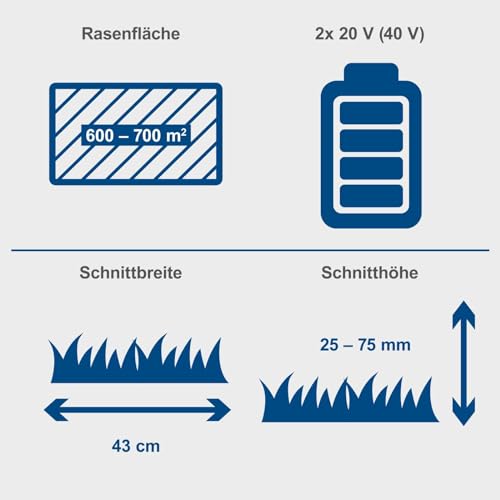 | Features | Leistungsstarker Akku-Rasenmäher mit 43 cm Schnittbreite mit 4in1-Funktion: Mähen, Fangen, Mulchen, Rasenkanteneinzug, Wartungsfreier, bürstenloser Motor (Brushless Motor) mit besonders hohem Wirkungsgrad, längerer Laufzeit, hoher Lebensdauer und geringem Verschleiß, Kabelloses Arbeiten mit der Scheppach IXES 20-Volt-Serie – alle Akkus und Ladegeräte aus der Systemreihe können mit dem Akku-Rasenmäher kombiniert werden, Geeignet für Gärten mit 600 – 700 m2, Kraftvolle 2x 20 V (40 V), Praktisches Bedienpanel ermöglicht die Einstellung der beiden Modi „Eco“ und „Auto“, Eco-Modus – niedrige Drehzahl für eine maximale Akkulaufzeit, Auto-Modus – die Drehzahl wird entsprechend der Belastung angepasst, Zentrale Schnitthöhenverstellung in 6 Stufen von 25 – 75 mm, Ergonomischer Komforthandgriff federt Vibrationen ab, Große 50 L Fangbox mit Füllstandsanzeige, Robustes Gehäuse mit integriertem Tragegriff für einfachen Transport, Batteriefach mit Sicherheitsschlüssel und klappbarer Schutzhaube, Beidseitiger Rasenkanteneinzug für sauberes Mähen auch in Randnähe, Geschliffene Klinge aus Spezialstahl – besonders robust und langlebig, Highwheeler – große, rasenschonende Laufräder sorgen für sicheren Halt auch in abschüssigem Gelände, Klappbarer und höhenverstellbarer Holm – für eine platzsparende Lagerung und eine ergonomische Arbeitshaltung, Inklusive Mulcheinsatz für die optimale Wiederverwendung von Rasenschnitt als Dünger |