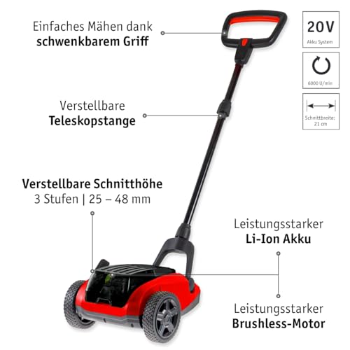 | Features | Leistungsstarker Bürstenloser Motor: Der bürstenlose Motor des WALTER Akku-Handrasenmähers sorgt für eine außergewöhnlich hohe Mähleistung und längere Laufzeiten. Zudem bietet er eine beeindruckende Langlebigkeit, was bedeutet, dass Sie länger Freude an Ihrem Gerät haben werden., Einstellbare Schnitthöhe in Drei Stufen: Mit einer flexibel einstellbaren Schnitthöhe von 25 bis 48 mm in drei Stufen können Sie die perfekte Rasenhöhe für Ihren Garten auswählen. Diese Anpassungsfähigkeit gewährleistet ein stets gepflegtes Erscheinungsbild Ihres Rasens., Leicht und Flexibel für Schwer Zugängliche Stellen: Dank der leichten Bauweise und dem schwenkbaren Griff lässt sich der Mäher mühelos manövrieren. Er ist ideal, um auch schwer zugängliche Stellen wie unter Sträuchern und Bänken zu erreichen, was Ihre Gartenpflege erheblich erleichtert., Effizienter 20V 2,0Ah Li-Ionen-Akku: Der im Lieferumfang enthaltene 20V 2,0Ah Li-Ionen-Akku bietet eine Laufzeit von etwa 20-25 Minuten bei voller Ladung. Der Akku ist in nur 60-90 Minuten vollständig aufgeladen, sodass Sie schnell wieder einsatzbereit sind., Kompakte Bauweise und Hohe Sicherheit: Die kompakte Bauweise des Mähers ermöglicht eine platzsparende Lagerung, was besonders in kleinen Haushalten von Vorteil ist. Zusätzlich sorgt die Einschaltsperre für einen sicheren Betrieb, indem sie ein unbeabsichtigtes Starten verhindert. |