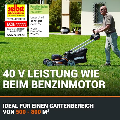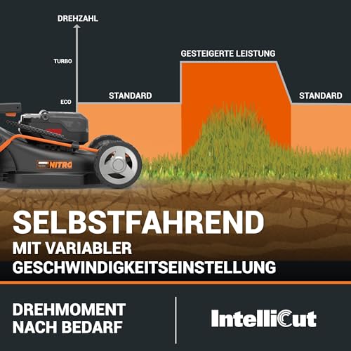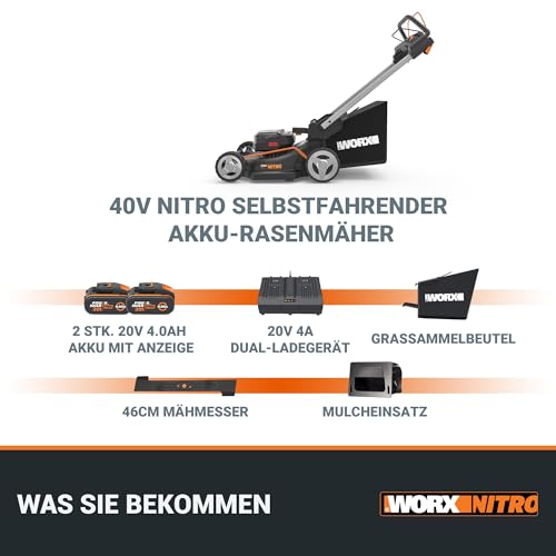 | Features | [HOCHEFFIZIENTER BÜRSTENLOSER MOTOR 2.0]: Der Nitro-Mäher bietet mehr Leistung und eine längere Laufzeit und ist so leistungsstark wie ein benzinbetriebener Mäher, ohne Geräusche und Lärm, ohne Schadstoffausstoß und mit höherer Kosteneffizienz, [Selbstfahrend]: Das selbstfahrende Hinterradantriebssystem mit variabler Drehzahl ist für den mühelosen Betrieb auf großen und schrägen Rasenflächen ausgelegt und macht das Mähen besonders komfortabel, [Intellicut-Technologie]: Die patentierte Intellicut-Technologie erhöht die Leistung, wenn das Gras dichter wird, und ermöglicht es Ihnen dann, die Leistung zu reduzieren, um den Akku zu schonen, [Einhand-Schnitthöhenverstellung]: Mit einem einzigen Handgriff können Sie die richtige Höhe ganz einfach einstellen. Dank der einstellbaren Schnitthöhe von 20 bis 80 mm kann er mühelos verschiedene Arbeitsanforderungen erfüllen, [Verstellbarer klappbarer Handgriff]: Der schnell verstellbare 3-Positionen-Griff ermöglicht es Ihnen, in der optimalen Position zu arbeiten und sorgt für mehr Komfort. So lässt sich der Mäher viel einfacher transportieren und lagern, [GLEICHER AKKU, ERWEITERBARE ENERGIE]: Die intelligenten WORX PowerShare PRO-Akkus bieten längere Laufzeiten sowie Hitze- und Stoßschutz. Kompatibel mit allen Worx 20V-, 40V- und 80V-Werkzeugen, Outdoor Power und Lifestyle Produkten, Lieferumfang: WG749E NITRO Akku-Rasenmäher, 2 x 4Ah Akkus, 4A Dual-Schnellladengerät, Grassammelbeutel, 46cm Mähmesser, Mulcheinsatz., Mindestens ein Akku ist tiefentladen (siehe Ladestatus der Batterie); bitte laden Sie die beiden Akkus auf, bevor Sie diese erneut nutzen oder lagern |
