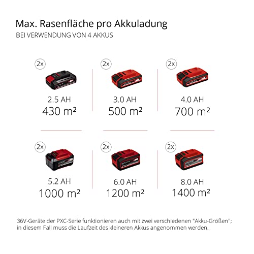 | Features | Mit dem Einhell Akku-Rasenmäher GE-CM 36/47 S HW Li und der innovativen Power X-Change-Technologie macht die Pflege des heimischen Grüns richtig Freude., PurePOWER Brushless – Der wartungsarme und kraftvolle Brushless-Motor sorgt für maximale Leistung bei längerer Laufzeit im Vergleich zu herkömmlichen Kohlebürstenmotoren., Durch die 4 im Lieferumfang enthaltenen Batterien und die 2 Twin-Charger-Schnelladegeräte ist ein längeres Mähen ohne lästiges Warten möglich., Praktisch ist das Einhell Holmkonzept inklusive Reinigungs- und platzsparender Lagerposition. Der höhenverstellbare Führungsholm mit Softgrip sorgt für angenehmes und ermüdungsfreies Arbeiten., Ein perfektes Schnittergebnis gelingt mit dem Einhell Vortex Technology Deck und der 6-stufigen Schnitthöhenverstellung. Als Highwheeler bewältigt der Rasenmäher auch anspruchsvolles Gelände., Seitenauswurfsfunktion und Deflektorheckauswurf leiten dabei das Schnittgut optimal zur Seite, ohne den Arbeitsprozess zu beeinträchtigen., Dank des praktischen Mulchadapters bietet der Akku-Rasenmäher auch eine Mulchfunktion. Zur optimalen Reinigung in der Reinigungsposition wird ein Schaber mitgeliefert. |