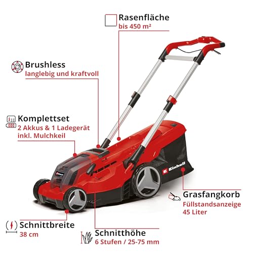 Einhell Akku-Rasenmäher GP-CM 36/450 Kit Power X-Change (36 V, 38 cm Schnittbreite, 450 m², Brushless, Mulchfunktion, 45 L Fangsack, inkl. 2 x 4,0 Ah Akkus + Twincharger)