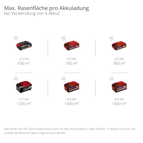 | Features | Power X-Change – Der Akku-Rasenmäher GP-CM 36/52 S Li BL ist Teil der Einhell Power X-Change Familie, in der Akkus, Ladegeräte und Systemgeräte flexibel kombiniert werden können., PurePOWER Brushless – Der wartungsarme und kraftvolle Brushless-Motor sorgt für maximale Leistung bei längerer Laufzeit im Vergleich zu herkömmlichen Kohlebürstenmotoren., Double-Twin-Pack Technologie – Die Double-Twin-Pack Technologie ermöglicht mehr Power bei doppelter Akku-Laufzeit. Mit 4 Akku-Steckplätzen kann lange Zeit gemäht werden., Radantrieb – Der Selbstfahrantrieb ist mit einer variablen Geschwindigkeitsregulation ausgestattet und erleichtert die Fortbewegung des Mähers in hohem Gras oder bei Steigungen., Mulchfunktion – Durch einen Mulchadapter wird die Mulchfunktion ermöglicht. Dadurch wird der Rasen auf natürliche Weise gedüngt und das Entleeren des Fangkorbs ist nicht notwendig., Perfekter Schnitt – Mit der 9-stufigen zentralen Schnitthöhenverstellung von 25-80 mm und der Schnittbreite von 52 cm gelingen breite Schnitte. Der Fangkorb fasst 65 L Schnittgut., Lieferung mit Akku – Der Akku-Rasenmäher GP-CM 36/52 S Li BL wird mit 4 x 5,2 Ah Power X-Change Akku und 2 x Twincharger-Ladegerät geliefert. |