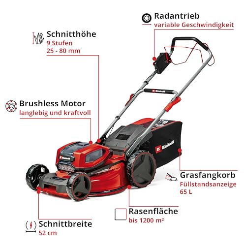 Einhell Akku-Rasenmäher GP-CM 36/52 S Li BL Kit Power X-Change (36 V, 52 cm Schnittbreite, bis 1200 m², Brushless, 65 L Fangkorb, Radantrieb, inkl. 4x 5,2 Ah + 2x Twincharger)