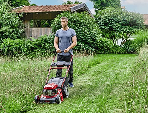 | Features | Für große Flächen – Der Einhell Benzin-Rasenmäher GC-PM 46 SM HW-E Li ist mit einer 9-stufigen Schnitthöhenverstellung ausgestattet und wird für Rasenflächen bis zu 1.400 m² empfohlen., Leistung – Sein kraftvoller luftgekühlter 1-Zylinder 4-Takt-Motor liefert 2 kW und ein hohes Drehmoment bis zu 2.900 Umdrehungen pro Minute., Einfacher Start – Dank E-Start kann der Einhell Benzin-Rasenmäher einfach und schnell per Knopfdruck gestartet werden. Ein 1,5 Ah Power X-Change Akku ist dafür im Lieferumfang enthalten., Hinterradantrieb – Der Rasenmäher ist mit einem abschaltbaren Hinterradantrieb ausgestattet, der kontinuierlichen Vorschub leistet und damit das Mähen auf großen Flächen erleichtert., Optimale Handhabung – Der ergonomische und klappbare Führungsholm mit Softgrip lässt sich dank der 3-stufigen Höhenverstellung optimal auf die Körpergröße anpassen., Großer Fangbehälter – Der strapazierfähige Grasfangsack fasst bis zu 65 Liter Grünschnitt. Dank der Füllstandsanzeige lässt sich jederzeit erkennen, wenn eine Leerung nötig wird., Mulchfunktion – Setzt man den mitgelieferten Mulchkeil ein und lenkt den Auswurf um, wird das Schnittgut zur natürlichen Düngung direkt auf dem Rasen verteilt. |