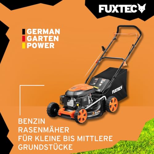 FUXTEC 3in1 Benzin Rasenmäher FX-RM4646ECO 3,5PS / 2,6kW | 46cm Schnittbreite & 7-stufige Schnitthöhenverstellung 25-75mm| 4-Takt Mäher – Inkl. 50L Grasfangkorb, Mulchfunktion & Reinigungsanschluss