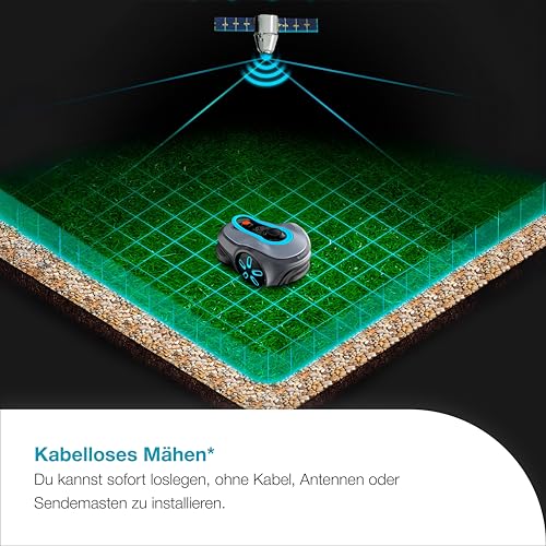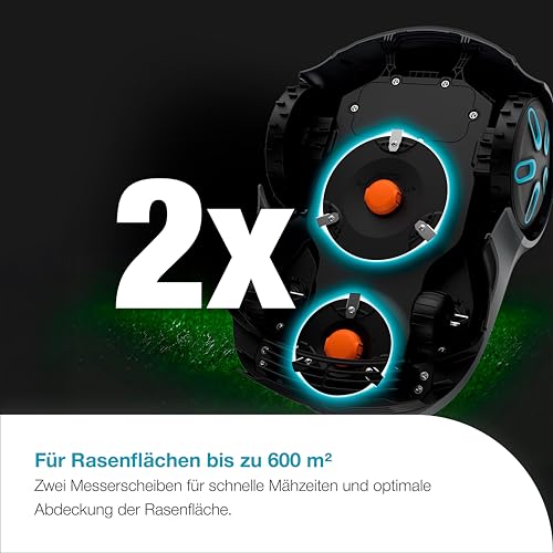 - Kann Rasenflächen bis zu 600 m² pflegen, ohne Begrenzungskabel