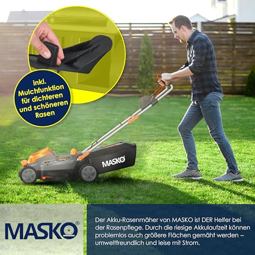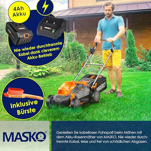 MASKO® Akku Rasenmäher inkl. Akku Li-Ion Batterie 4Ah und Ladegerät – Rasentrimmer Schnittbreite 33cm, 5-fache 25-75mm Schnitthöhenverstellung Fangkorb 30 Liter, bis 150m² Flächen