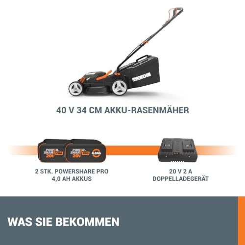 WORX WG779E.1 Akku-Rasenmäher 40V (2 x 20V) – 34 cm Schnittbreite – ideal für Gärten bis zu 460m² – IntelliCut Technologie – einfache Aufbewahrung – inkl. 2x4Ah Akkus & Dual-Schnellladegerät
