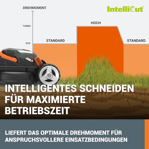 Der WORX Akku-Rasenmäher nutzt zwei 20V Akkus, um eine effektive Leistung von 40V zu erzielen. Dies ermöglicht ein müheloses Mähen auch bei dichterem Gras, was ihn ideal für größere Rasenflächen macht. Durch die IntelliCut Technologie kann der Mäher die Leistungsstärke an die Rasenbedingungen anpassen, was nicht nur den Akku schont, sondern auch einen gleichmäßigeren Schnitt gewährleistet.