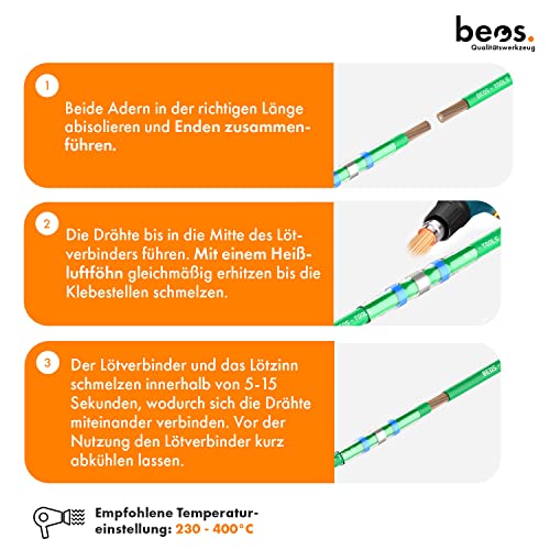 ✅ KOMPATIBEL MIT ALLEN MARKEN – Die Lötverbinder von BEOS sind kompatibel mit allen gängigen Herstellern wie Husquarna Automower, Worx Landroid, Gardena, Landxcape, Bosch Indego, Yard Force, AL-KO, Robomow, Wolf Garten, Stihl iMow, Ambrogio uvm.., ✅ NUR EINMAL KABEL VERLEGEN – Mit den Lötverbindern von BEOS sind sie auf der sicheren Seite: Optimale Verbindung und Zugfestigkeit, kein ausgelaufenes oder ausgetrocknetes Gel wie bei herkömmlichen Verbindern., ✅ KEINE KORROSION – Die Lötverbinder erzeugen eine wasserdichte und zugfeste Lötverbindung und verzichten dabei völlig auf metallische Klemmen. Somit ist eine Korrosion ausgeschlossen – auch nach vielen Jahren., ✅ EINFACHE HANDHABUNG – Einfach Kabel abisolieren, Lötverbinder über die abisolierten Bereiche schieben und mit der Heißluftföhn erhitzen., ✅ QUALITÄT VON BEOS Wir bei BEOS haben seit Jahrzehnten eine Leidenschaft für Gartenarbeit und Heimwerken. Umso mehr wissen wir wie wichtig ein gutes Werkzeug ist. Unsere Lötverbinder werden unter höchsten Qualitätsstandards produziert, damit Sie nie wieder eine Bruchstelle im Begrenzungsdraht suchen müssen. Wir kümmern uns um das richtige Werkzeug, damit Sie sich voll und ganz auf Ihren Traumgarten konzentrieren können.