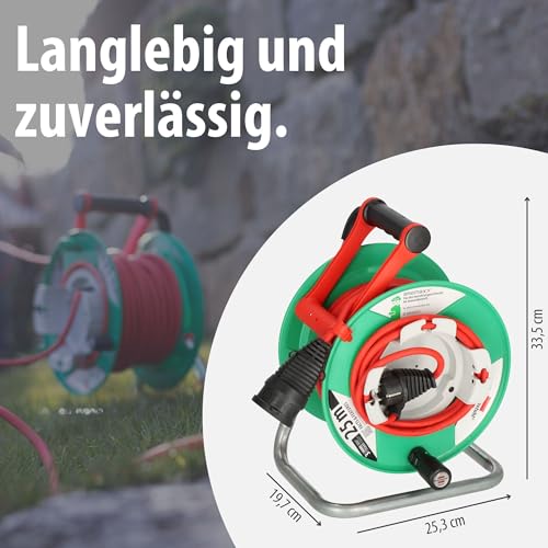 | Features | Kabeltrommel 25m für außen (AT-N05V3V3-F 3G1,5) mit Bremaxx Kabel – extrem stabil, einsetzbar bis -35 °C, öl- und UV-beständig und zudem extrem abriebfest, Kabeltrommel für Rasenmäher mit cleverem Pendelgriff "CABLEPILOT", welcher für freie Hände beim Transport, praktisches Aufhängen und schnelles Ab- und Aufrollen sorgt, Garten-Kabeltrommel mit Trommelkörper aus Spezialkunststoff auf verzinktem Tragegestell mit zusätzlichem Überhitzungsschutz und Kontroll-Leuchte bei Überhitzung und Überlastung, Verlängerungskabeltrommel mit Stecker und Kupplung eignet sich bestens als praktische Stromquelle für diverse Gartenarbeiten, wie beispielsweise für das Rasenmähen, Hecken schneiden usw., Kabeltrommel mit stabilem Drehgriff für ein komfortables Aufrollen und einer praktischen Steckergarage zum schnellen Verstauen des Kabels |