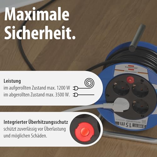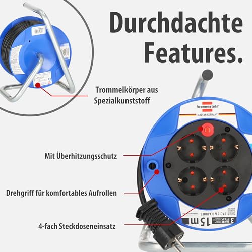 | Features | Kabeltrommel mit einer 15m Kabellänge (H05VV-F 3G1,5) – handlich und leicht, Kabelrolle mit zusätzlichem Überhitzungsschutz, Trommelkörper aus Spezialkunststoff auf verzinktem Tragegestell, Kabeltrommel mit 4 Schutzkontakt-Steckdosen und erhöhtem Berührungsschutz, Die Brennenstuhl Kabeltrommel überzeugt anhand folgender Features: Made in Germany, Drehgriff, robustes Kabel, Kontroll-Leuchte, Überhitzungsschutz, Trommeltritt als ideale Ergänzung und zahlreiche Qualitätsprüfungen |