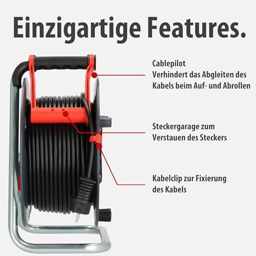 | Features | Die Kabeltrommel mit 50m Kabellänge (H05VV-F3G1,5) und Überhitzungsschutz für maximale Sicherheit ermöglicht eine flexible Nutzung in verschiedenen Einsatzbereichen, Auf der Rückseite der 50m outdoor Kabeltrommel befindet sich die Bremsnocke zur Fixierung des Trommelkörpers während des Transports, Die Kabeltrommel ist mit einem Trommelkörper aus Spezialkunststoff auf verzinktem Tragegestell und einem Drehgriff für komfortables Aufrollen ausgestattet, Kabeltrommel outdoor mit 3 Schutzkontakt-Steckdosen mit erhöhtem Berührungsschutz, spritzwassergeschützt IP44, mit selbstschließenden Deckeln – eignet sich für die vorübergehende und zeitlich begrenzte Verwendung im Freien, Der innovative Tragegriff "cablepilot" sorgt für eine perfekte Kabelführung und verhindert das Abgleiten des Kabels beim Auf- und Abrollen – sorgt für freie Hände beim Transport und praktisches Aufhängen |