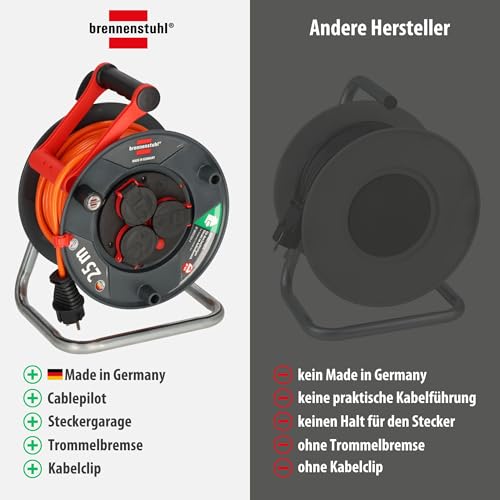 | Features | Kabeltrommel mit 40m Kabellänge (AT-N05V3V3-F 3G1,5) mit Bremaxx Kabel -extrem stabil, einsetzbar bis -35 °C, ölund UV-beständig und zudem extrem abriebfest, Kabeltrommel 40m outdoor mit Überhitzungsschutz, Trommelkörper aus Spezialkunststoff auf verzinktem Tragegestell und Drehgriff für ein komfortables Aufrollen, Kabeltrommel außen mit 3 Schutzkontakt-Steckdosen, spritzwassergeschützt IP44, mit selbstschließenden Deckeln, Innovativer Tragegriff "cablepilot" sorgt für eine perfekte Kabelführung und verhindert das Abgleiten des Kabels beim Auf- und Abrollen, sorgt für freie Hände beim Transport und praktisches Aufhängen, Die Brennenstuhl Kabeltrommeln überzeugen anhand folgender Features: Made in Germany, Cablepilot mit Steckergarage, Kabelclip, robustes Kabel, Überhitzungsschutz, Trommelbremse, Trommeltritt als perfekte Ergänzung und zahlreiche Qualitätsprüfungen |