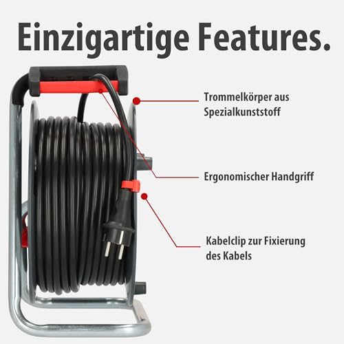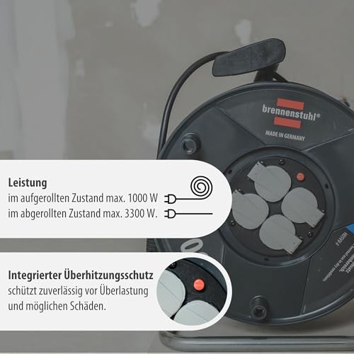 Kabeltrommel mit 50m Kabellänge (H05VV-F 3G1,5) mit ergonomischem Handgriff mit Achse für die ideale Kabelführung beim Auf- und Abrollen, Kabelrolle mit Überhitzungsschutz und einer Leistung im aufgerollten Zustand von 230V: 1000W und im abgerollten Zustand von 230V: 3300W, Trommelkörper aus Spezialkunststoff auf verzinktem Tragegestell und mit Bremsnocke zur Fixierung des Trommelkörpers während des Transports, Kabeltrommel mit 4 Schutzkontakt-Steckdosen mit selbstschließenden Deckeln, Die Brennenstuhl Kabeltrommel überzeugt anhand folgender Features: Made in Germany, Kabelclip, robustes Kabel, Überhitzungsschutz, Trommeltritt als ideale Ergänzung und zahlreiche Qualitätsprüfungen