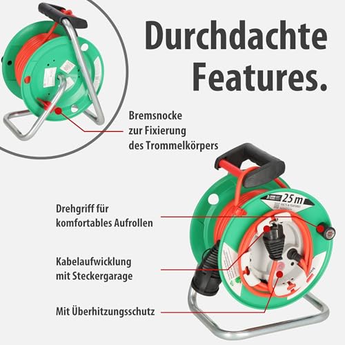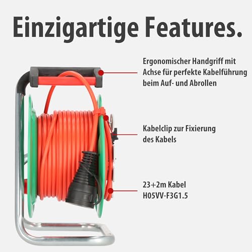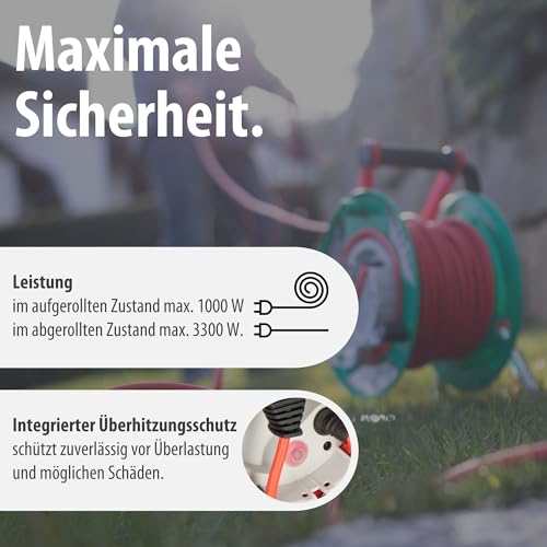 | Features | Kabeltrommel 23+2m für die vorübergehende und zeitlich begrenzte Verwendung im Freien (IP44) eignet sich ideal für den Gebrauch im Garten zum Anschluss elektrischer Gartengeräte, Kabeltrommel für Rasenmäher mit integrierter Kabelfixierung, praktischer Steckergarage und ergonomischem Handgriff mit Achse für eine ideale Kabelführung beim Auf- und Abrollen, Gartenkabeltrommel mit Trommelkörper aus Spezialkunststoff auf verzinktem Tragegestell mit zusätzlichem Überhitzungsschutz und Kontroll-Leuchte bei Überhitzung und Überlastung, Verlängerungskabeltrommel mit Stecker und Kupplung eignet sich bestens als praktische Stromquelle für diverse Gartenarbeiten, wie beispielsweise für das Rasenmähen, Hecken schneiden usw., Garant G IP44 Gartenkabeltrommel mit 25m Kabel in signalrot – durch die Signalfarbe macht man sich und die Menschen in der Umgebung auf herumliegende Kabel und potenzielle Stolperfallen aufmerksam |