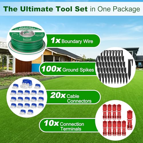 - Umfassendes Kit: Begrenzungskabel, 100 Erdnägel und Verbindungselemente für einfache Installation