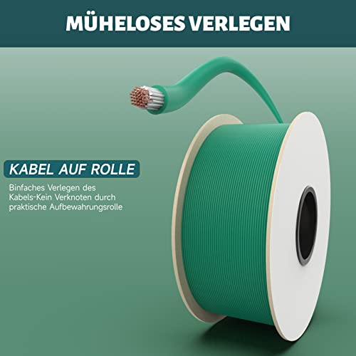 Durch die grüne Farbe fügt sich das Kabel harmonisch in die Rasenfläche ein, wodurch das ästhetische Gesamtbild des Gartens nicht beeinträchtigt wird. Die Ummantelung schützt das Kabel vor Witterungseinflüssen, was es ideal für den ganzjährigen Einsatz macht.