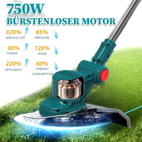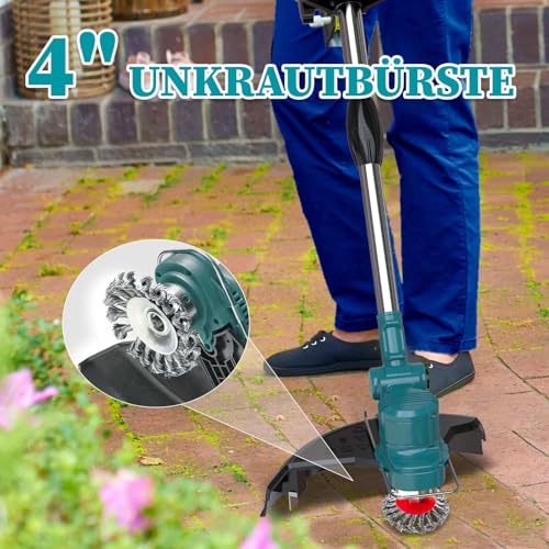 【Leistungsstarker bürstenloser Motor】2024 Upgraded rasentrimmer mit akku ist mit einem 750W bürstenlosen Motor ausgestattet, der die Reibung reduziert und es dem motorsense ermöglicht, bis zu 18.000 Umdrehungen pro Minute zu drehen, was eine effizientere Leistung für den akku rasentrimmer, längere Arbeitszeit und längere Lebensdauer bietet., 【Super lange Batterielebensdauer】Freischneider mit unkrautbürste ist mit 2 x 4.0Ah Batterien für höhere Effizienz und längere Laufzeit, Auf Knopfdruck zeigen die LEDs der Batterie den verbleibenden Ladestand an. Aus Sicherheitsgründen, die Batterien sind nicht voll aufgeladen während des Transports, bitte laden Sie sie vollständig vor dem ersten Mal der Verwendung, um die erwartete Arbeitszeit zu erhalten., 【4 Arten von Schneidklingen】Der akku rasentrimmer mit unkrautbürste ist mit 3 Arten von 23 cm Durchmesser Klingen ausgestattet, die Kreissägeblatt ist geeignet für das Schneiden von dornigen Sträuchern und Schösslingen, die Metallklinge ist sehr geeignet für das Schneiden von dickem Gras und Unkraut, und der Fadenspule(Tap & Go) für junges Gras, eine Drahtbürste(10cm) funktioniert gut für die Reinigung von Moos und Wachstum von Gehwegen., 【Anwenderfreundlich】Der freischneider akku hat eine verstellbare Teleskopstange, die die Länge von 102-142 cm einstellen kann.Bietet bedarfsgerechte Längen für Menschen aller Höhen, ohne sich zu bücken.Und der Unkrautvernichter ist mit einem Schultergurt ausgestattet, der die Belastung des Arms reduzieren kann, ist entspannter Gartenarbeit. 90° drehbarer Trimmerkopf für Arbeiten an schwer zugänglichen Stellen, Ideal zum Trimmen um Höfe und Büsche., 【Lightweight & Safe】Motorsense Akku nur 2.39kg, ergonomischer weicher Griff verbessert den Komfort und die Kontrolle. auch die Frauen oder ältere Menschen können es leicht kontrollieren. Ausgestattet mit doppeltem Sicherheitsstartschalter und Unkrautspritzschutzabdeckung, um Verletzungen durch versehentlichen Start und Unkrautspritzer zu verhindern., 【Package Included】1 x Rasentrimmer mit akku, 2 x 4.0Ah Akkus, 1 x 9" Sägeblatt, 2 x 4" Rotierende Unkrautbürste, 2 x 9" Flache Metallklinge, 1x Fadenspule, 1x Benutzerhandbuch., Kundendienst: Wenn Sie Fragen zu unserer rasentrimmer mit akku haben, können Sie sich gerne an uns wenden. KONTAKTIEREN SIE UNS: Ihr Amazon-Konto > klicken Sie auf „Ihre Bestellungen“ > finden Sie die Bestell-ID > klicken Sie auf „Verkäufer kontaktieren“.