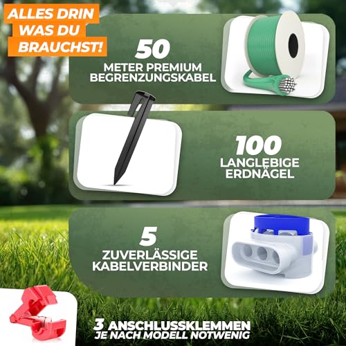 - Umfang: 50 Meter Begrenzungskabel, 100 Erdhaken und 20 Kabelverbinder