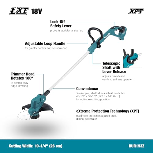 Der Makita DUR193Z Akku-Rasentrimmer erleichtert dir die Gartenarbeit mit geringem Gewicht und ergonomischem Design. Der teleskopierbare Schaft und der verbesserte Frontgriff bieten Komfort und Flexibilität für individuelle Anwendungen. Ideal für einen gepflegten Rasen!