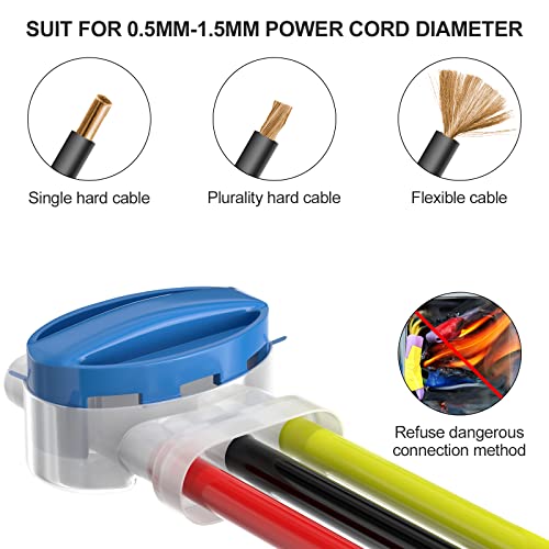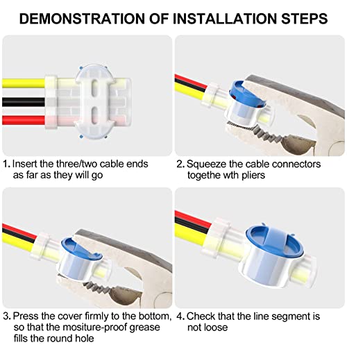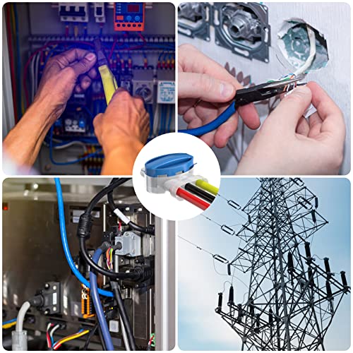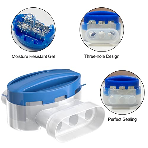 【Praktische Kabelverbinder】 20 professionelle 314 wasserdichte Kabelverbinder, die die T-Brücken-Verbindungsmethode anwenden, ohne die Hauptleitung zu durchtrennen, verlängern die Grenzlinie des Rasenroboters., 【Einfach zu bedienen】 Stecken Sie einfach das Ende des Kabels in den Kabelverbinder, kein Löten und Abisolieren erforderlich, und drücken Sie es dann mit einer Zange zusammen, es ist einfach und sicher., 【Hohe Qualität】 Der Kabelverbinder des Rasenroboters besteht aus hochwertigem ABS-Material, mit einer weißen Schale und einer blauen Kappe, die Verbindungsklinge besteht aus hochwertigem Kupfer, ist mit Gel gefüllt, wasserdicht und feuchtigkeitsbeständig., 【Anwendbar auf alle Roboter-Rasenmäher】 Der Kabelanschluss hat 3 Löcher zur Aufnahme von 2 oder 3 Kabelverbindungen, kompatibel mit den meisten Roboter-Rasenmähermodellen wie R40Li, R45Li, R70Li usw., geeignet für 0,5 mm² bis 1,5 mm² (22- 14 AWG) Drahtgröße, 【Weit verbreitet】 Wasserdichte Kabelverbinder werden nicht nur in Rasenmähern verwendet, sondern auch in der Außen- und Gartenbeleuchtung, Autoverkabelung, Motoren, elektrischen Steuerungen oder an anderen Orten.