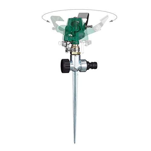 | Features | Gartenbewässerung: Impulssprenger zum Wässern von Rasen, Gemüse- und Blumenbeete – Bis ca. 450 m², Sektoren: Einstellbarer Kreisregner im 20 bis 360° Winkel – Bewässerung kleiner und großer Flächen, Reichweite: Sprinkler mit Klappe zur Regulierung der Sprühstrahlweite – Max. 24 m im Durchmesser, Beregnung: Gartenregner zerstäubt das Wasser für gleichmäßige Verteilung und gegen Pfützenbildung, Details: Beregner aus Metall HxBxT: ca. 28,5 x 11 x 6 cm – Montage mittels Erdspieß und Klickstecker |