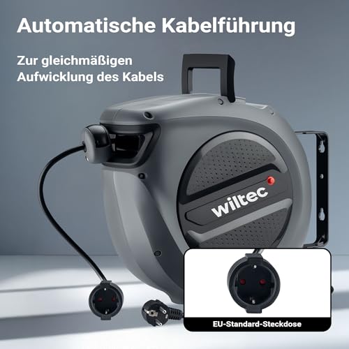 Wiltec Kabeltrommel 20 m + 2 m, automatischer Kabelaufroller 1500 – 3200 W, Verlängerungskabel Trommel 180° Halterung, robuste Kabel Trommel