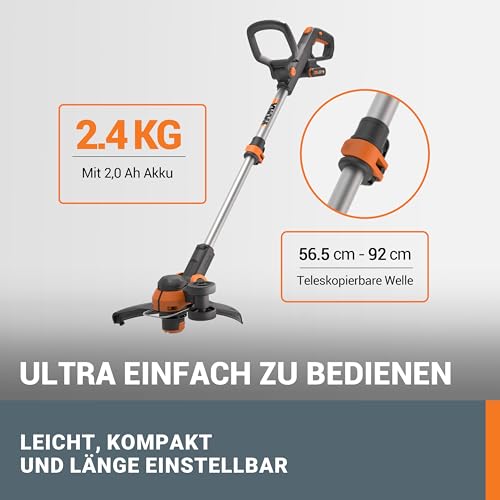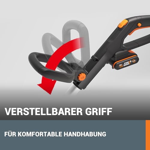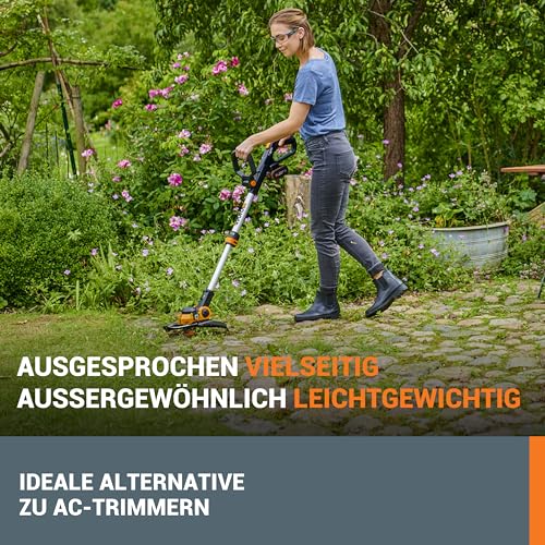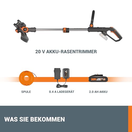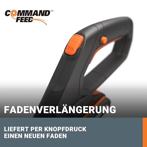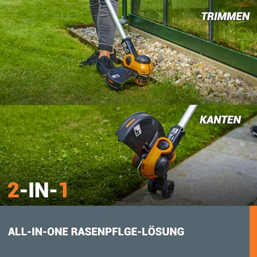 | Features | 2-IN-1: Grass-Trimmer und Kantenschneider Werkzeug. Lässt sich in Sekundenschnelle vom Faden-Trimmer zum Radkantenschneider umwandeln., SOFORTIGE FADENZUFUHR: Innovatives Command-Feed-Fadensystem für sofortige Fadenzufuhr durch Knopfdruck., 90° DREHBARER TRIMMERKOPF: Damit können Sie auf abschüssigem Gelände schneiden und kanten und schwer zugängliche Stellen erreichen., GUMMIERTE RÄDER: Unterstützen und führen den Kantenschneider, damit Sie geradere Linien und sauberere Schnitte erhalten., KOMFORT & KOMPAKT: Die Teleskopstange und der Handgriff sind höhenverstellbar und bieten dadurch maximale Sicherheit und Arbeiten in einer angenehmen Position bei jeder Körpergröße, GLEICHER AKKU, ERWEITERBARE ENERGIE: Der Worx PowerShare-Akku ist mit allen Worx 20V-, 40V- und 80V-Werkzeugen, Outdoor Power- und Lifestyle-Produkten kompatibel., Lieferumfang: 1x WORX WG163E.1 Akku-Rasentrimmer, 1x Spule WA0004, 1x Sicherheitsschutz, 1x Rad zum Kantenschneiden, 1x Akku, 1x Ladegerät |
