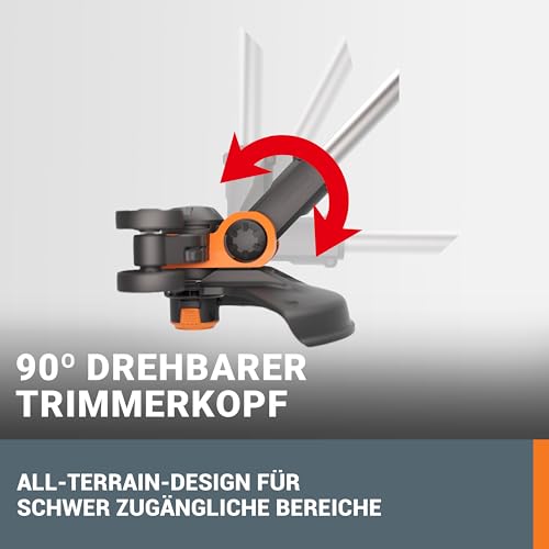 - 90° drehbarer Trimmerkopf: Ideal für schwer zugängliche Stellen und abschüssige Gärten.
