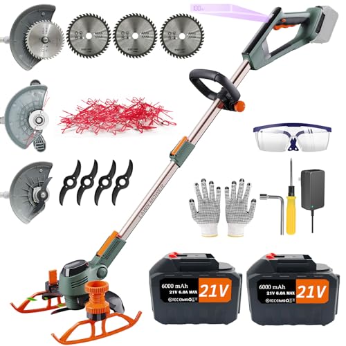 | Features | 🌿【Multifunktions-Rasentrimmer】: 4-in-1-Rasentrimmer/Radkantenschneider/Mini Rasenmäher/Freischneider., 🌿【Super lange Batterielebensdauer】: Wird mit 2 x 21 V 6,0 Ah-Batterien geliefert. Sie müssen sich zu keinem Zeitpunkt Sorgen um die Batterielebensdauer machen, zwei 6,0 Ah-Batterien können alle Ihre täglichen Reinigungsbedürfnisse erfüllen., 🌿【Mit Trimmhilfsrädern】: Drehen Sie einfach den Maschinenkopf, installieren Sie die Mähfäden. Verwandeln Sie ihn in Sekundenschnelle in einen Radkantenschneider, stützen und führen Sie den Kantenschneider, sodass Sie geradere Linien und sauberere Schnitte erhalten., 🌿【Mit zusätzlicher Grasschubhalterung】: Installieren Sie die zusätzliche Grasschubhalterung und das gebogene Metallmesser, um einen Mini-Mäher zu schaffen, der problemlos das Mähen großflächiger Rasenflächen bewältigen kann., 🌿【Kreissägeblatt aus Manganstahl】: Starke Schneidfähigkeit, geeignet zum Schneiden dicker Strauchzweige. Erledigt die Schnittarbeiten wie ein Freischneider., 🌿【Leicht und in mehreren Positionen einstellbar】: Leichtes Design, die Maschine wiegt nur 1,9 kg und der Maschinenkopf, der Griff und die Höhenposition sind einstellbar, um maximalen Komfort und Kontrolle zu bieten., 🌿【Service und Paket enthalten】Paket beinhaltet: 1 x Rasentrimmer, 2 x 6.0 Ah Akku, 1 x Ladegerät, 3 x Sägeblätter, 4 x Metallklingen, 30 x Trimmerfaden, 1 x Handschuhe und 1 x Sicherheit Gläser. Wir bieten einen freundlichen Kundenservice rund um die Uhr, damit Sie sich keine Sorgen nach dem Kauf machen müssen. |