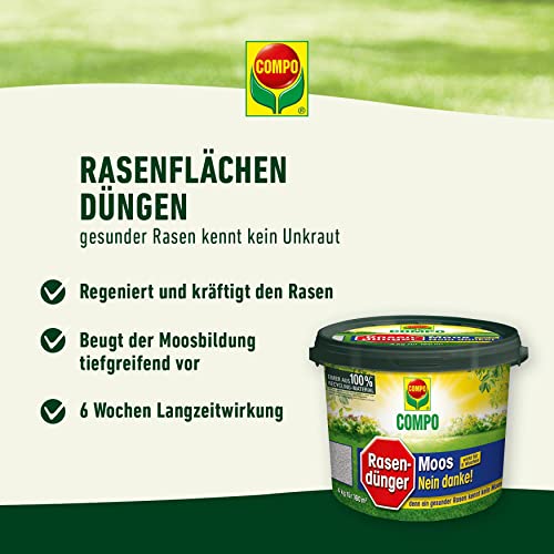 Der Compo Rasendünger Moos – Nein Danke! sorgt für einen kräftigen, widerstandsfähigen Rasen. Mit schnell verfügbaren Nährstoffen optimierst du die Regeneration und erhältst einen gesunden Rasen – ideal für die Pflege zwischen März und September.