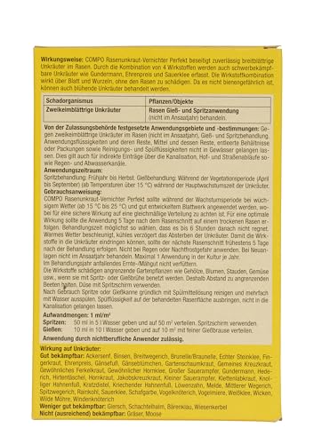 | Features | Unkrautvernichter für den Rasen: Konzentrat zur Vernichtung schwerbekämpfbarer Unkräuter, bekämpft u.a. Gundermann, Ehrenpreis, Braunelle, Löwenzahn und Kleearten, nicht bienengefährlich, Bekämpft schnell und zuverlässig Unkraut im Rasen: Rasenunkrautvernichter mit 4 Wirkstoffen, wirkt über das Blatt bis in die Wurzel, beschädigt nicht den Rasen, nicht bienengefährlich, Einfache Anwendung: Konzentrat mit Wasser verdünnen und den Rasenunkrautvernichter gleichmäßig verteilen, zum Spritzen oder Gießen geeignet, Anwendung von April – September, Anwendungszeitraum Compo Rasenunkrautvernichter: Anwendungszeitraum während der Wachstumsperiode ab 15 °C bis 25 °C, Anwendung 5 Tage nach dem Rasenschnitt auf einem trockenen Rasen, Lieferumfang: 1 x COMPO Rasen Unkrautvernichter Perfekt, kühle, trockene und frostfreie Lagerung in Originalverpackung, Konzentrat (200 ml) reichen für 200 m², Art.-Nr. 25389 |