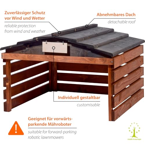 | Features | 💚 Außenmaße: ca. 78,5 x 74 x 52,5 cm (L x B x H), Innenmaße: ca. 71 x 66 x 35 cm (B x T x H), 💚 Die Mährobotergarage bietet zuverlässigen Schutz vor Wind und Wetter, 💚 Das abnehmbare Dach ermöglicht einen guten Zugang zum Automower in der Garage, 💚 Das auffällige schwarz-braune Design macht die Mährobotergarage zu einem Hingucker im Garten, 💚 Der Unterstand besteht aus wetterfest lasiertem Fichtenholz (Picea abies, Hauptholzart) aus der EU |