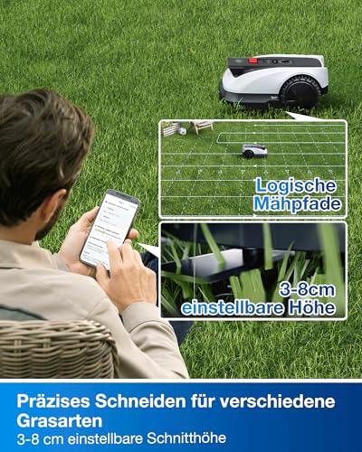 Die Schnitthöhe lässt sich bequem zwischen 3 cm und 8 cm einstellen, sodass der Mähroboter sich unterschiedlichsten Rasenarten und Pflegeansprüchen anpassen kann. Durch diese Flexibilität bietet der Goat Mäher eine hervorragende Lösung für verschiedene Gartenstile.