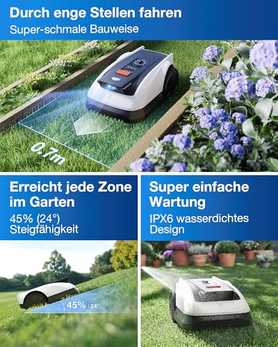 Mit einer Schnittbreite von 220 mm und einer Mähgeschwindigkeit von bis zu 0,5 m/s ist der Mähroboter in der Lage, 180 m² in einer Stunde zu bearbeiten. Diese Leistungsstärke ist besonders vorteilhaft für größere Rasenflächen, auf denen eine effiziente Mäharbeit gewünscht ist. Der leistungsstarke 4000 mAh Akku sorgt dafür, dass der Roboter längere Arbeiten ohne Unterbrechung ausführen kann.