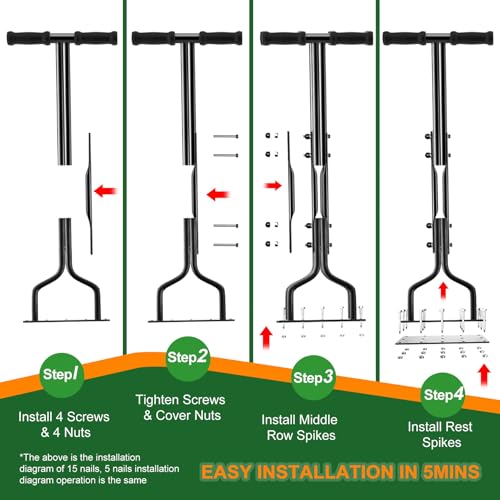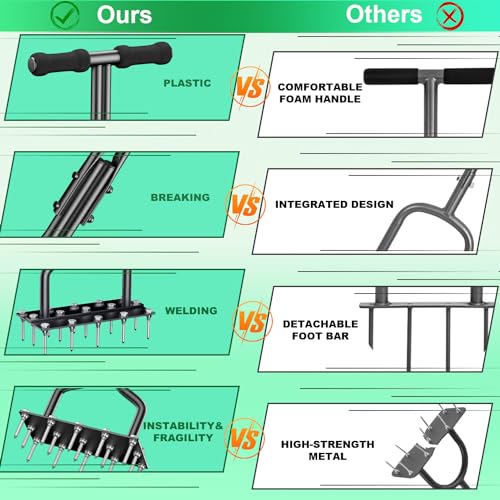 | Features | 💡💡💡【2024 Einzigartiges 2-IN-1 Rasenlüfter】Aerifizierer für rasen von EEIEER mit innovativem 2IN1 Design, das je nach Ihren Vorlieben&Nutzungsszenarien zusammengebaut werden kann: Hocheffizienter 15-Spitze rasenbelüfter (komplette Installation) oder tragbarer 5-Spitze rasenspecht.Mit hochwertigen Metallspikes aus dickem Stahl müssen Sie sich keine Sorgen über die Verwendung von Nägeln machen,nachdem Rost&Biegen häufig auf dem Rasen verwendet werden müssen.Ein tolles Preis-Leistungs-Verhältnis!, 🌱【Effektives Rasen Belüften】Unser rasen aerifizieren lockert schnell den Boden & das Gras, bricht Bodenkrusten auf, verbessert den Luft-, Wasser- &Nährstofffluss zu Ihren Rasenwurzeln, was zu einem gesünderen & lebendigeren Rasen führt. Fördern Sie außerdem die Kompostierung &Bewässerung, damit Ihr Rasen besser aussieht. TIPPS: Um optimale Ergebnisse zu erzielen, empfiehlt es sich, Ihren Rasen vor der Verwendung des Rasenluftbelüfters zu bewässern, insbesondere wenn er hart, trocken &gelb ist., 👍【Zeit und Arbeitsersparnis】Mit 15 scharfen 6cm langen Metallnägeln, die gleichzeitig arbeiten und mühelos in die unteren Bodenschichten eindringen, um eine gründliche Belüftung zu gewährleisten. 15 Löcher in jedem Schritt, um eine größere Fläche in kürzerer Zeit abzudecken, sparen Sie Zeit und Energie. Ein großzügig dimensioniertes Spike-Design verhindert effektiv das Problem, dass sich ein großes Stück Erde direkt anhebt, was Schäden am Rasen verhindern und die Ästhetik beeinträchtigen kann., ✔【Robust & Langlebig】Auf Langlebigkeit ausgelegt, mit langlebiger, hochwertiger 2mm dicker Eisenkonstruktion, behandelt mit Präzisionsspritz- und Lichtbogenschweißverfahren, um Haltbarkeit und Rostbeständigkeit zu gewährleisten. Der ergonomische 96cm lange Griff verhindert eine Belastung des Rückens während der Arbeit, der gepolsterte T-Griff ist rutschfest und bequem, die breite und dicke Grundplatte ermöglicht ein müheloses Herunterdrücken der Spikes & hält einem Druck von bis zu 136kg stand., 💝【Extra kostenloses Gartenwerkzeug】Unser rasenlüfter wird mit einem zusätzlichen Gartenwerkzeug zur bequemen Verwendung geliefert. Unser Rasenbelüfter wird mit allen notwendigen Werkzeugen und Anweisungen für eine schnelle und einfache Installation geliefert, die nur ein paar Minuten dauert! Verabschieden Sie sich von komplizierten Montageprozessen und unerschwinglichen rollenden manuellen Belüfter-Rasenwerkzeugen. mit dem EEIEER aerifizierer für rasen schaffen Sie eine schöne Gartenterrasse. |