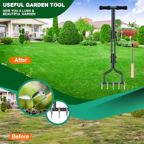 EEIEER Rasenlüfter Aerifizierer für Rasen, 2-in-1 Rasenbelüfter Vertikutierer 15 Spikes Rasen Belüften mit Gartenwerkzeuge, T-Griff Rasenspecht Handvertikutierer für Verdichtete Böden Rasenpflege