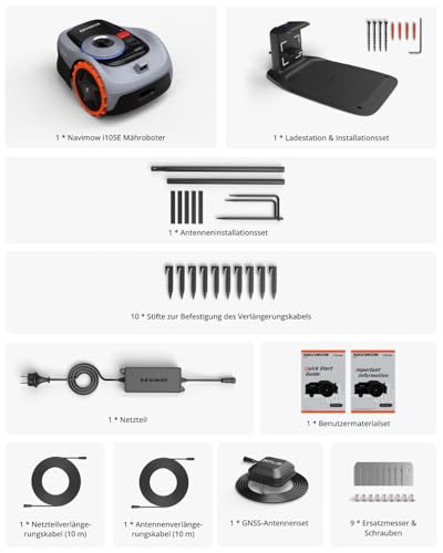 Die Wartung des Navimow i105E gestaltet sich ebenfalls unkompliziert. Mit 9 Ersatzklingen und Schrauben im Lieferumfang hast du alles, was du brauchen könntest, um den Roboter in Top-Zustand zu halten. Auch die Reinigung des Geräts ist schnell erledigt.