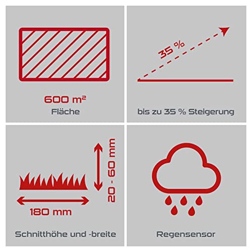 | Features | Ideal für Gärten bis 600 qm, Geräuscharm – nur 62 dB, Schnittbreite 180 mm, Schnitthöhe von 20-60 mm stufenlos einstellbar, Mit Kantenmähfunktion für saubere Rasenkanten, Steigungen bis zu 35% möglich, Steuerung per App via WiFi oder Bluetooth, Diebstahlschutz über individuelle PIN, Digitaldisplay und App-Steuerung für Mähzeit, Startpunkt, Regensenor, Start und Stopp, Sensibler Hindernissensor zum Schutz von Kindern und Tieren, Lieferumfang: Mähroboter, Schnellladestation, 130 m Begrenzungskabel, 180 Bodenanker, 3 vormontierte Messer und 6 Ersatzmesser |
