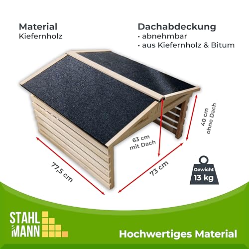 Schütze deinen Mähroboter mit der STAHLMANN Garage aus hochwertigem Kiefernholz! Sie bietet optimalen Wetterschutz, ist einfach zu montieren und ermöglicht einen bequemen Zugang. Ideal für eine langlebige und umweltfreundliche Aufbewahrung im Garten.