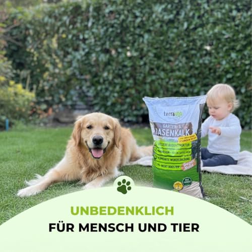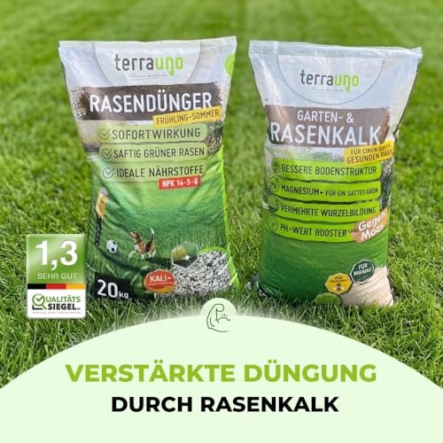 TerraUno Rasenkalk Frühjahr gegen Moos & Unkraut, Moosfreier Rasen in 14 Tagen, verstärkt Rasendüngung, 15 kg für 300 m², Extra feines Gartenkalk, Für den Streuwagen, Tierfreundlich