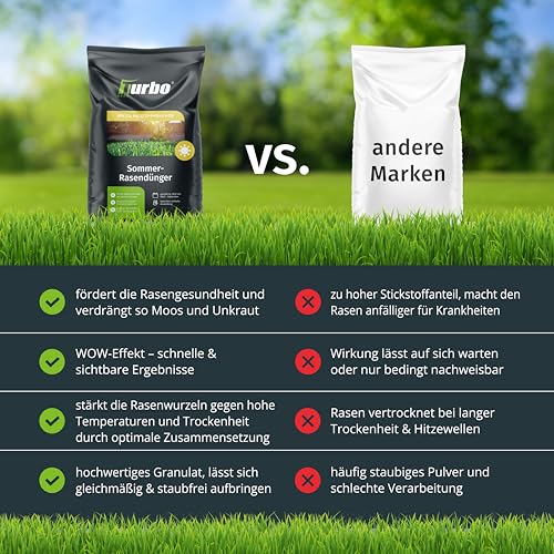 Turbogrün Rasendünger Sommer 20kg, gesunder Rasen verdrängt Moos, Ideal im Sommer, geeignet für Streuwagen, staubarmes Granulat, Rasen dünger, Rasenpflege